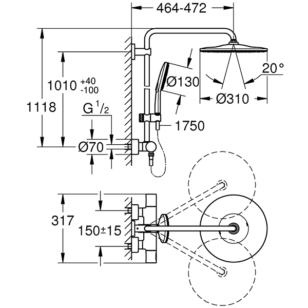 Верхний душ; Ручной душ; Штанга; Кронштейн; Шланг; Набор креплений