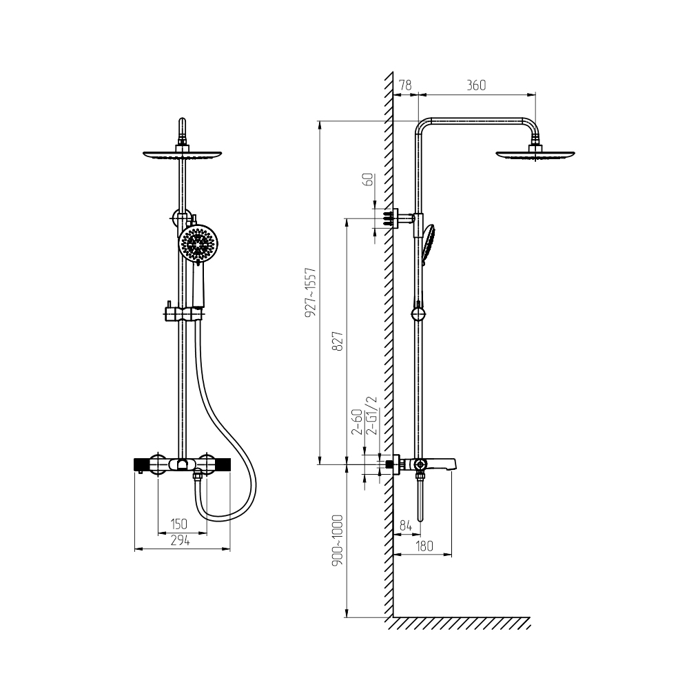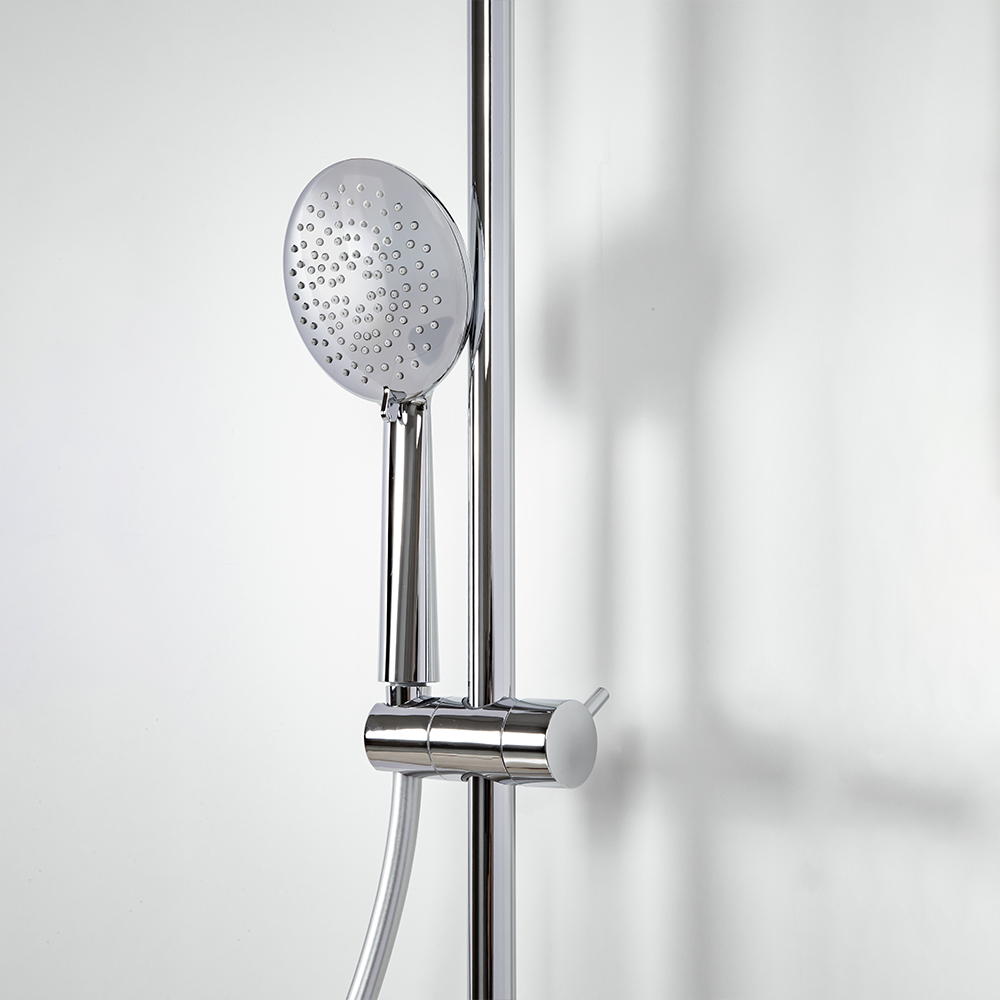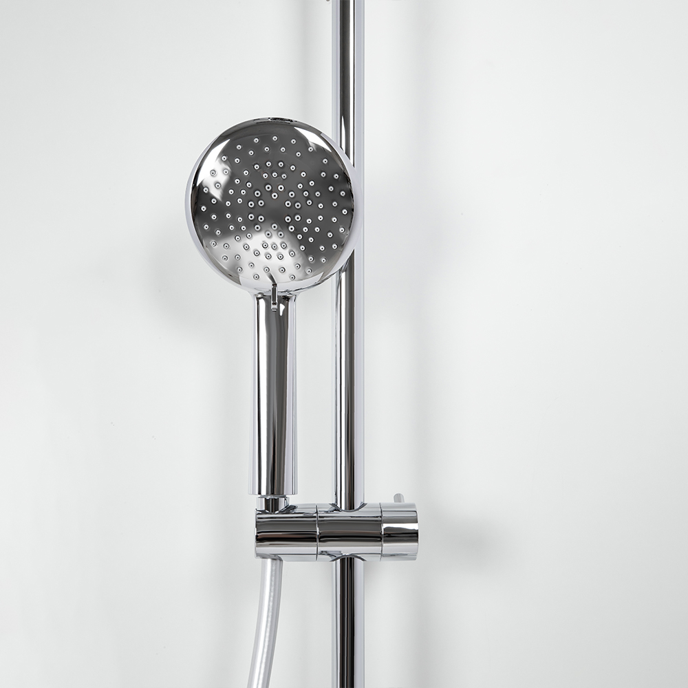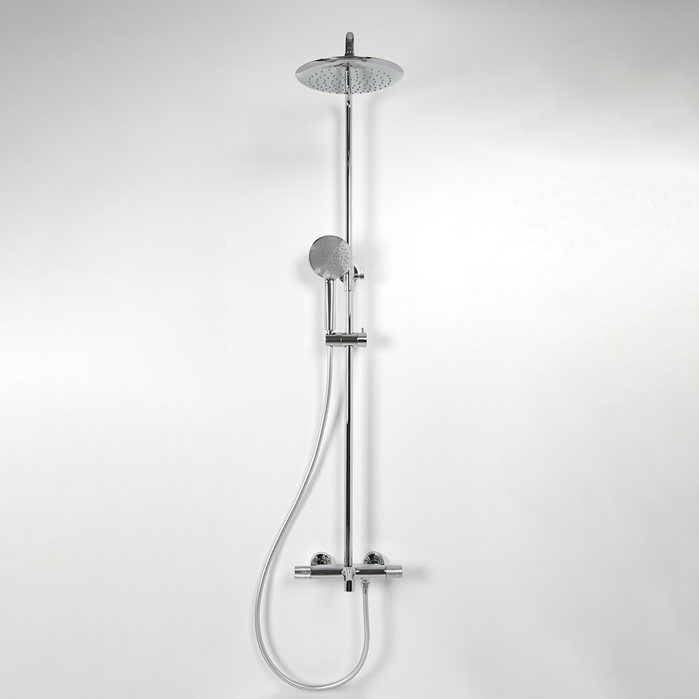 душевая стойка; комплект эксцентриков; термостат; верхний душ; душевой шланг; ручной душ; инструкция.