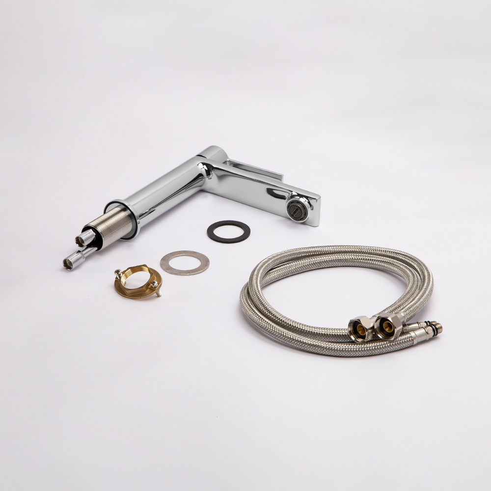 смеситель; комплект креплений; комплект гибкой подводки; инструкция.