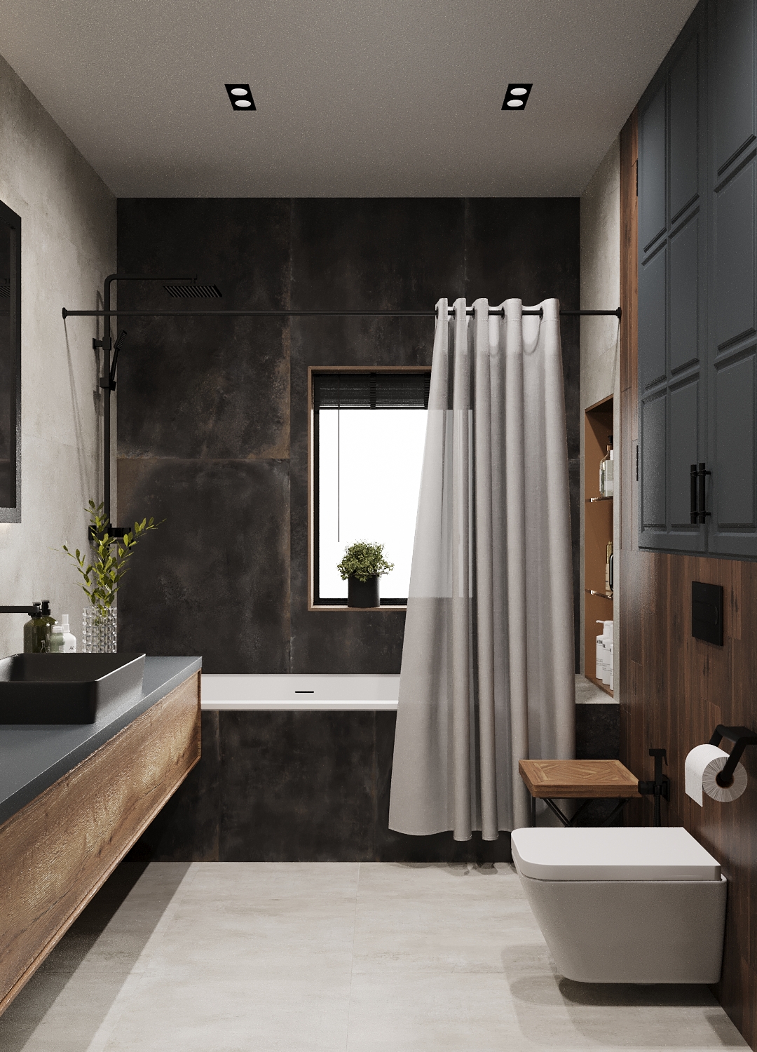 Функциональная небольшая ванная комната в частном доме, оформленный в стиле хайте для молодой семьи. Основной задачей было создать практичный и эстетичный интерьер, но без значительных затрат. В качестве ключевого акцента выбрана раковина от Аквамира черного цвета, этот цвет продолжен (дополнен) мною в смесителе AVS, кнопкой смыва и полотенцесушителем, душевой стойки. Этот интерьер очень брутальный, но при этом уютный благодаря включению природных материалов, таких как двери из массива над подвесным унитазом, За этими дверями прекрасно поместились все принадлежности хозяев дома. Он также сочетает в себе продуманную эргономику и утонченную эстетику.